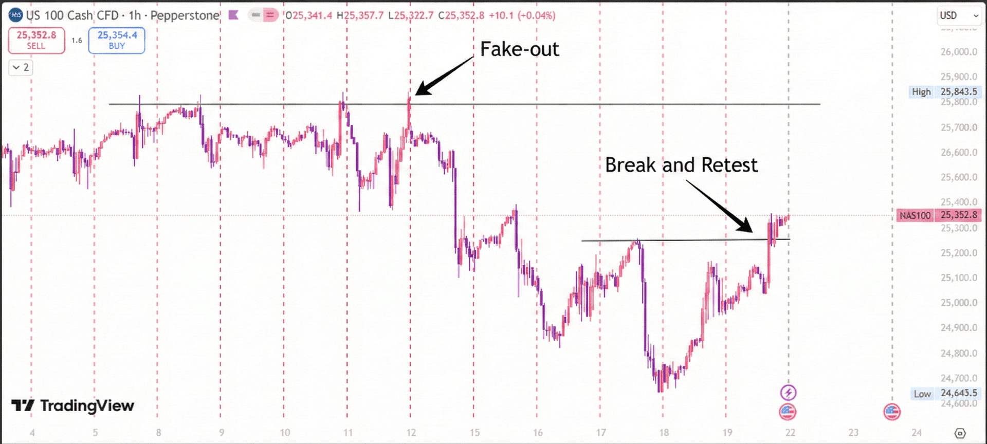 Take a look at this recent NAS100 chart. You can clearly see the difference between a trap and a valid entry: